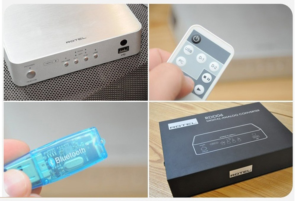 Ưu điểm đáng kể của Rotel RDD-06 so với các USB DAC cùng tầm giá là khả năng kết nối với nguồn phát không dây qua chuẩn bluetooth. Nhà sản xuất kèm theo một Bluetooth adapter cắm trực tiếp vào ngõ USB phía trước của thiết bị giúp nhận tín hiệu từ các thiết bị không dây như điện thoại, máy tính bảng, laptop… Rotel RDD-06 sử dụng chip giải mã DAC cao cấp của Wolkson hỗ trợ tín hiệu tối đa 24-bit ở tần số lấy mẫu 192kHz. Mạch giải mã cho băng thông khá rộng, lên đến 95kHz (+/- 3dB). Độ méo hài chỉ 0,004% cho thấy mạch clock RDD-06 được thiết kế khá kỹ lưỡng với bộ lọc kỹ thuật số dạng tiêu chuẩn.