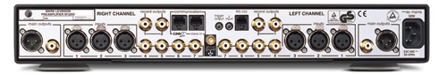Mặt sau của máy là đầu ra main và record riêng biệt, cũng như hai cổng Link communication để dùng trong hệ thống Mark Levinson Link.