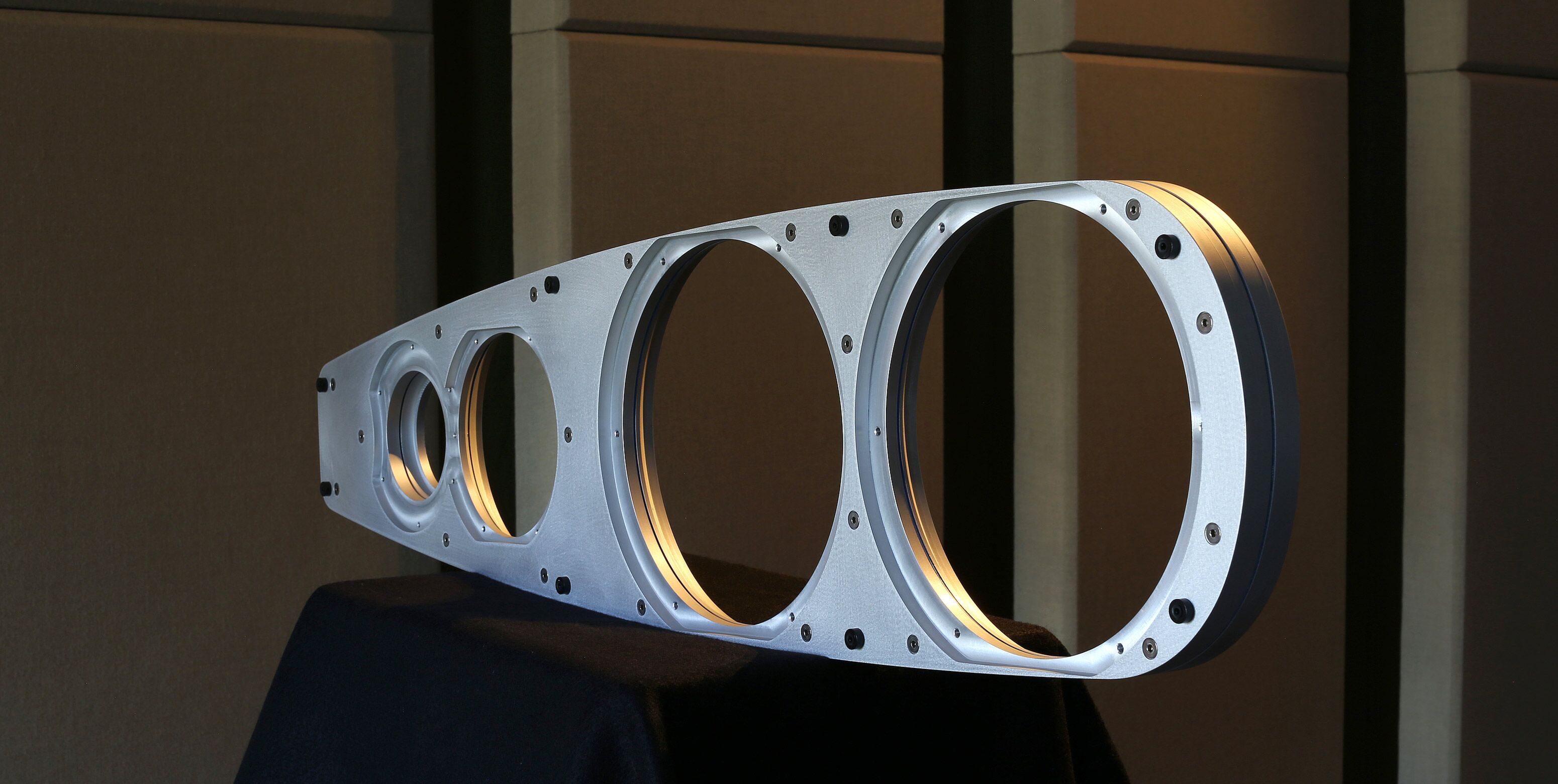 The Cygnus features our new Aluminum/MDF hybrid construction, where the baffle is machined from two ¾” thick, aircraft grade aluminum plates that sandwich a viscoelastic polymer, forming a 1 ½” thick, constrained-mode damped composite sub-baffle. This aluminum sub-baffle assembly is in turn bolted and bonded onto the enclosure’s 3 inch thick MDF inner baffle. All of the drive units are mounted to the aluminum sub-baffle assembly, which results in a dramatically lower noise floor, as well as greater dynamic articulation and resolution from the drive units themselves.